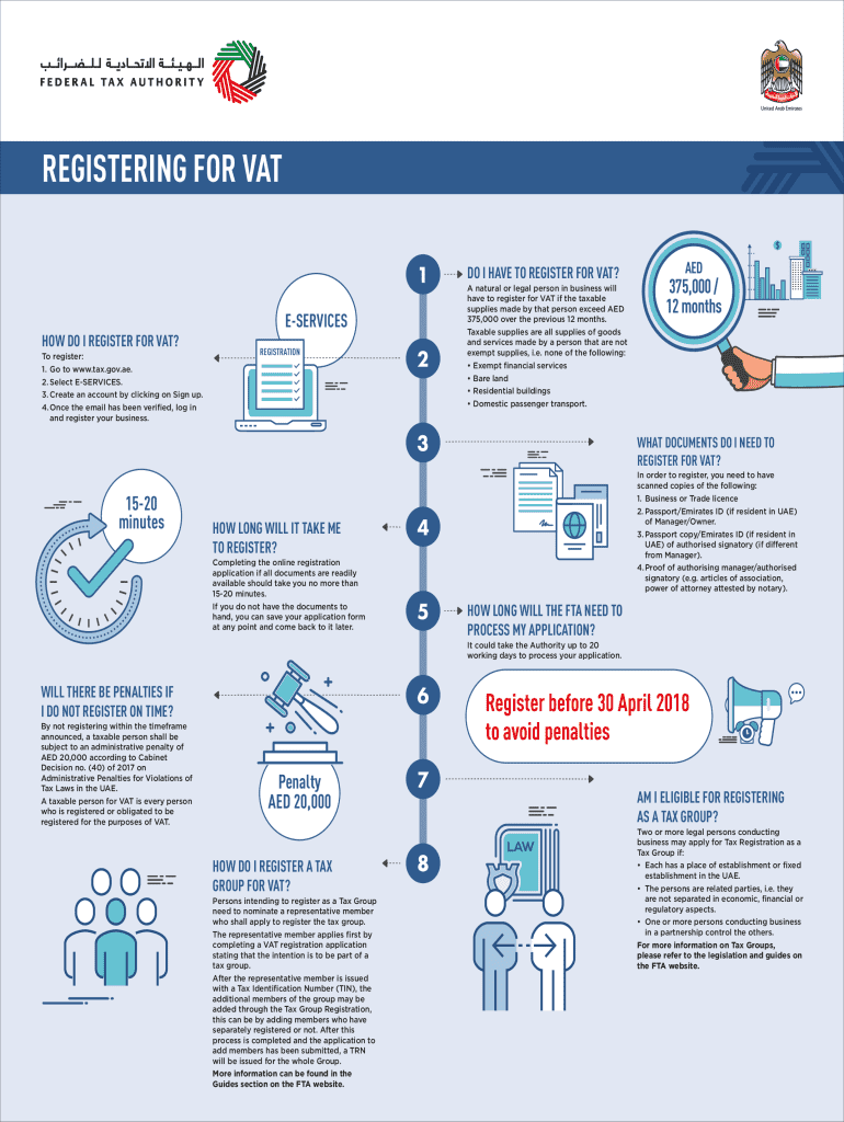 REGISTERING FOR VAT DO I HAVE TO REGISTER FOR VAT?HOW DO I REGISTER FOR VAT? To register: 1. Go to www.tax.gov.ae. 2. Select ESERVICES. 3. Create an account by clicking on Sign up. 4. Once the email
