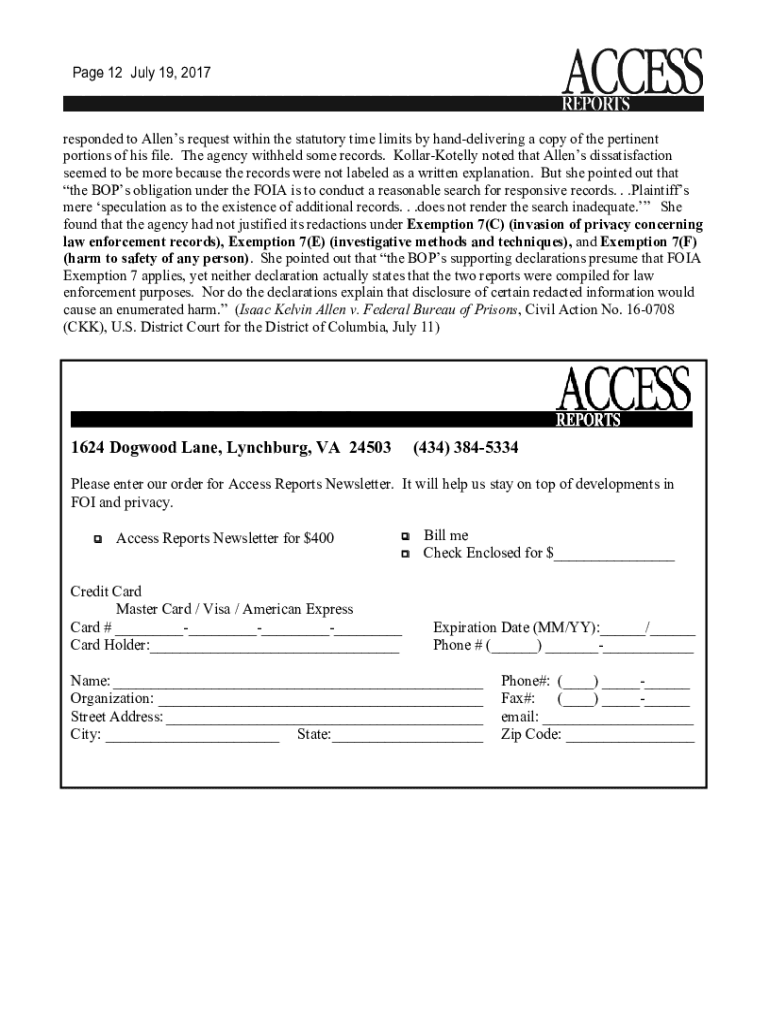 Volume 43, Number 14 July 19, 2017A Journal of News & Developments, Opinion & Analysis In this Issue Court Finds Agency Search Limited to Records In Its Possession ................ 1 Views from the