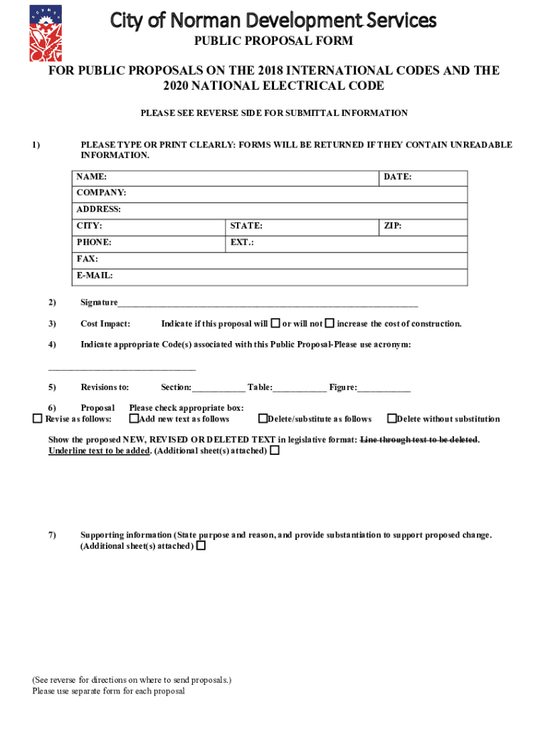 City of Norman Development Services PUBLIC PROPOSAL FORM FOR PUBLIC PROPOSALS ON THE 2018 INTERNATIONAL CODES AND THE 2020 NATIONAL ELECTRICAL CODE PLEASE SEE REVERSE SIDE FOR SUBMITTAL INFORMATION1)PLEASE