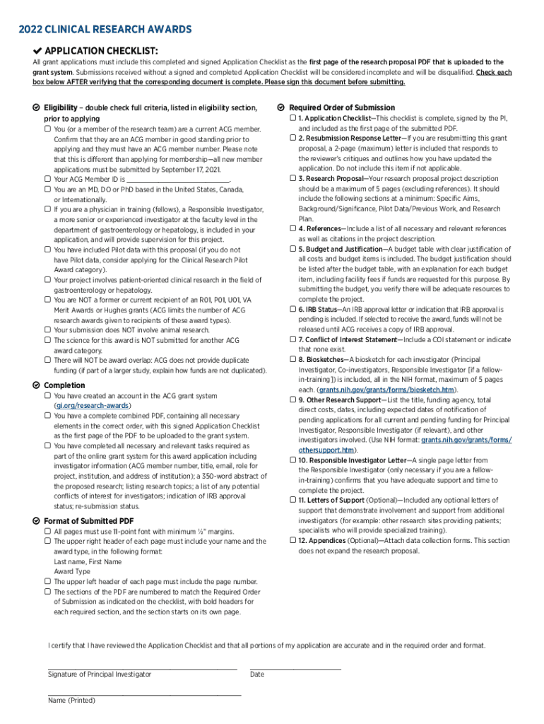 2022 CLINICAL RESEARCH AWARDS APPLICATION CHECKLIST: All grant applications must include this completed and signed Application Checklist as the first page of the research proposal PDF that is uploaded