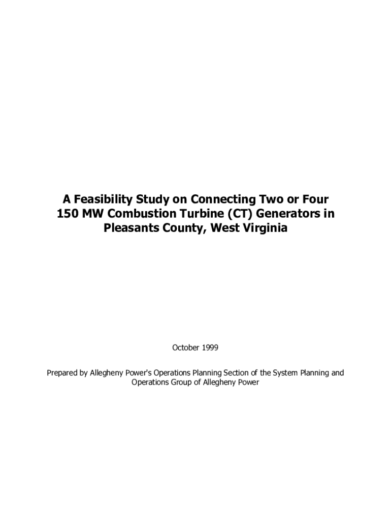 A Feasibility Study on Connecting Two or Four 150 MW Combustion Turbine (CT) Generators in Pleasants County, West Virginia October 1999 Prepared by Allegheny Power\'s Operations Planning Section of