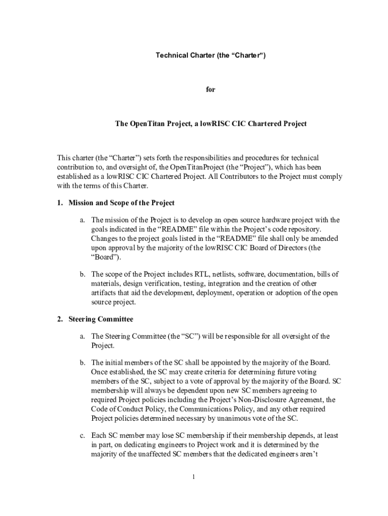 Technical Charter (the Charter)forth Open Titan Project, a low RISC CIC Chartered Projects charter (the Charter) sets forth the responsibilities and procedures for technical contribution to, and oversight
