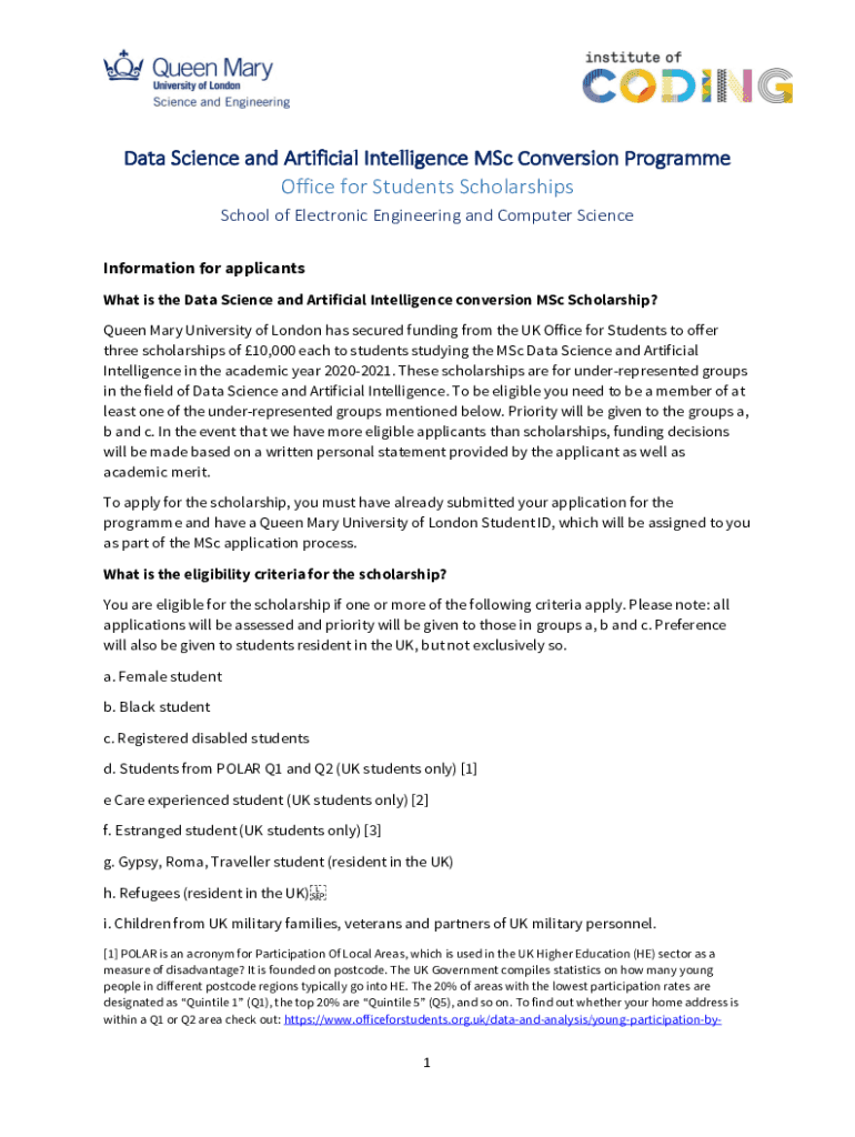 Data Science and Artificial Intelligence M.Sc. Conversion Program Office for Students Scholarships School of Electronic Engineering and Computer Science Information for applicants What is the Data