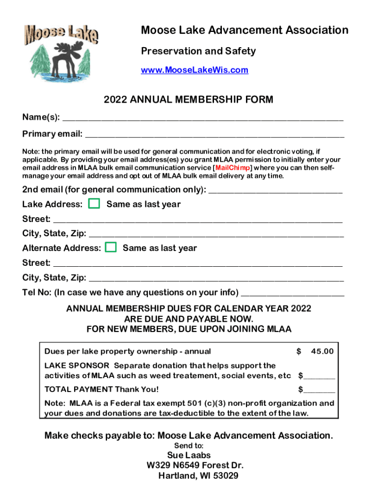 Moose Lake Advancement Association Preservation and Safety www.MooseLakeWis.com2022 ANNUAL MEMBERSHIP FORM Name(s): ___ Primary email: ___ Note: the primary email will be used for general communication