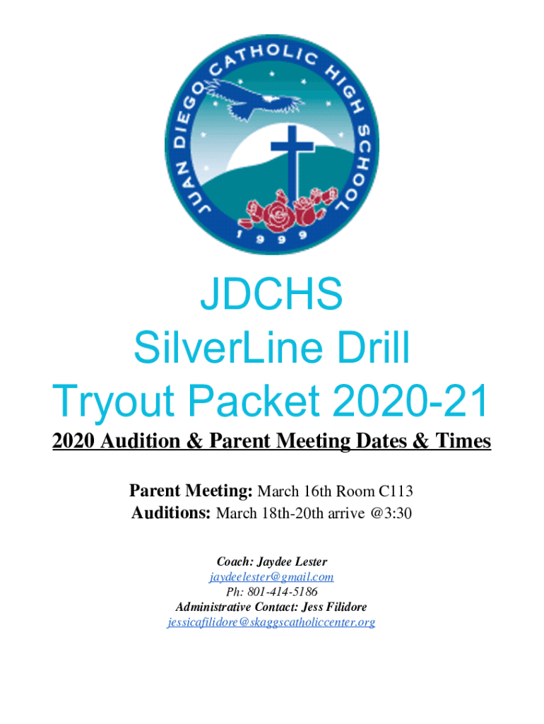 JD CHS Silvering Drill Tryout Packet 202021 2020 Audition & Parent Meeting Dates & Times Parent Meeting: March 16th Room C113 Auditions: March 18th20th arrive in @3:30 Coach: Jaycee Lester jaydeelester@gmail.com