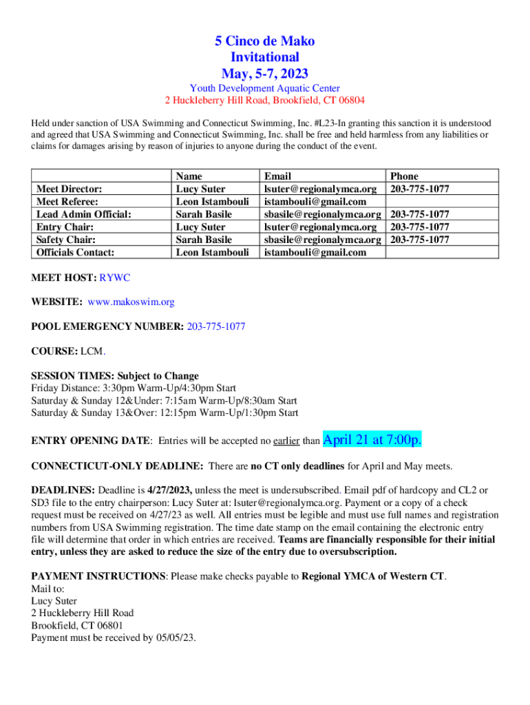 5 Cinco de Mako Invitational May, 57, 2023 Youth Development Aquatic Center 2 Huckleberry Hill Road, Brookfield, CT 06804 Held under sanction of USA Swimming and Connecticut Swimming, Inc. #L23In