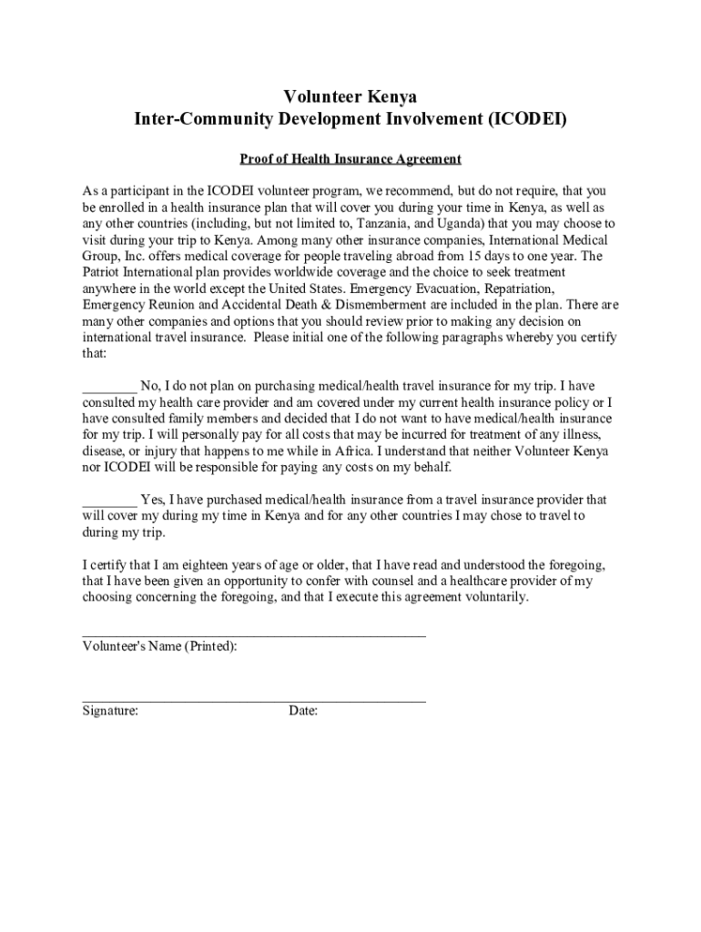 Volunteer Kenya Intercommunicate Development Involvement (ICO DEI) Proof of Health Insurance Agreement As a participant in the ICO DEI volunteer program, we recommend, but do not require, that you