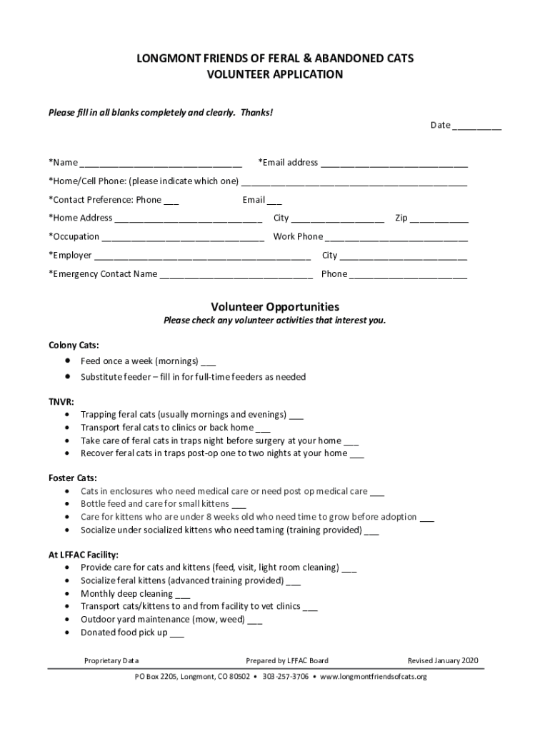 LONGMONT FRIENDS OF FERAL & ABANDONED CATS VOLUNTEER APPLICATION Please fill in all blanks completely and clearly. Thanks! Date ___*Name ___*Email address ___*Home/Cell Phone: (please indicate which