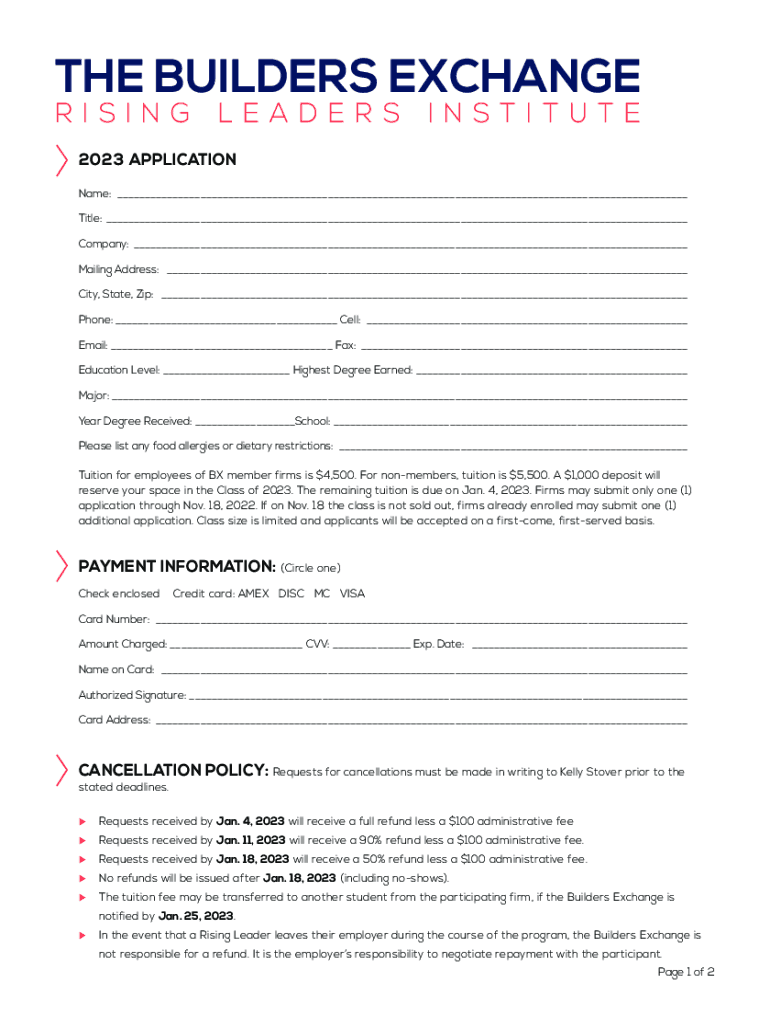 THE BUILDERS EXCHANGE RISING LEA HER SIN STI TUTE2023 APPLICATION Name: ___ Title: ___ Company: ___ Mailing Address: ___ City, State, Zip: ___ Phone: ___ Cell: ___ Email: ___ Fax: ___ Education Level: