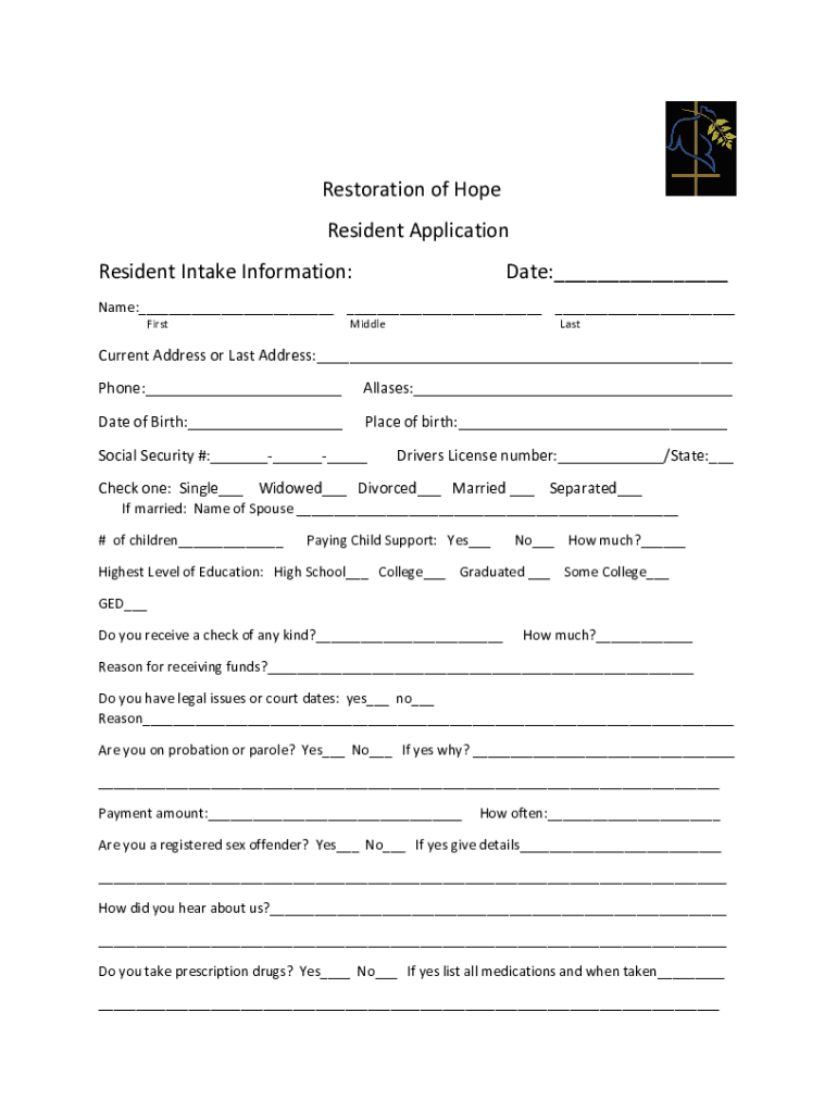 Restoration of Hope Resident Application Resident Intake Information:Date:___Name:___ ___ ___ FirstMiddleLastCurrent Address or Last Address:___ Phone:___Aliases:___Date of Birth:___Place of birth:___Social