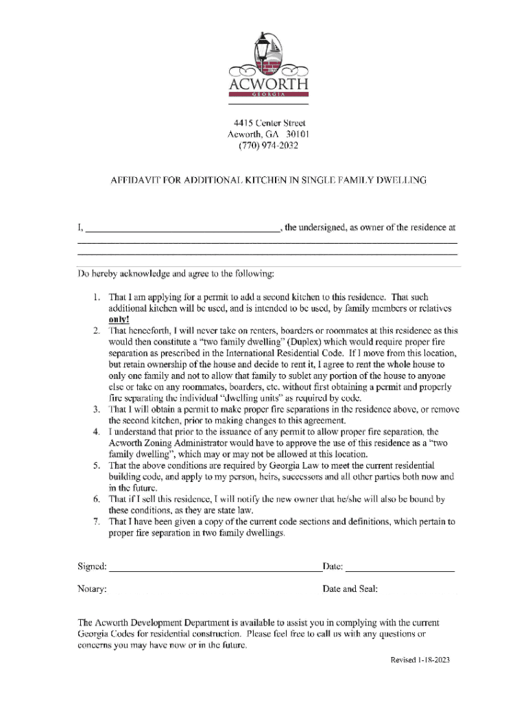 4415 Center Street Ac worth, GA 30101 770) 9742032AFFIDAVIT FOR ADDITIONAL KITCHEN IN SINGLE FAMILY DWELLING, ___, the undersigned, as owner of the residence Aldo hereby acknowledge and agree to the
