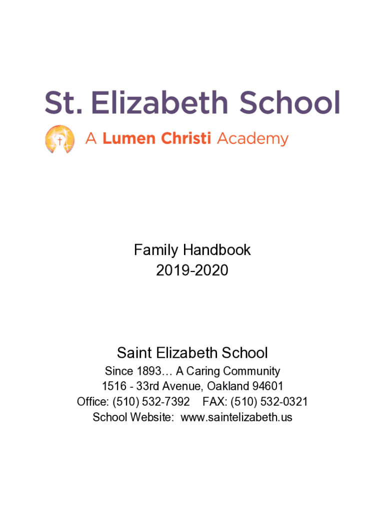 Family Handbook 20192020Saint Elizabeth School Since 1893 A Caring Community 1516 33rd Avenue, Oakland 94601 Office: (510) 5327392 FAX: (510) 5320321 School Website: www.saintelizabeth.usI.GENERAL