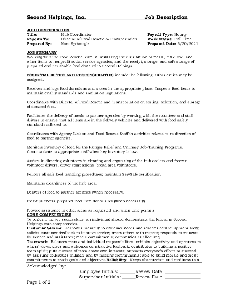 Second Helpings, Inc. Job Description IDENTIFICATION Title: Hub Coordinator Reports To: Director of Food Rescue & Transportation Prepared By: Nora SpitznoglePayroll Type: Hourly Work Status: Full