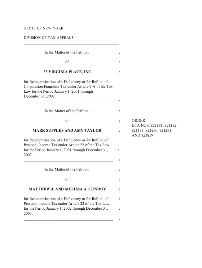 STATE OF NEW YORK DIVISION OF TAX APPEALS___ In the Matter of the Petition:of:33 VIRGINIA PLACE, INC.:for Redetermination of a Deficiency or for Refund of : Corporation Franchise Tax under Article