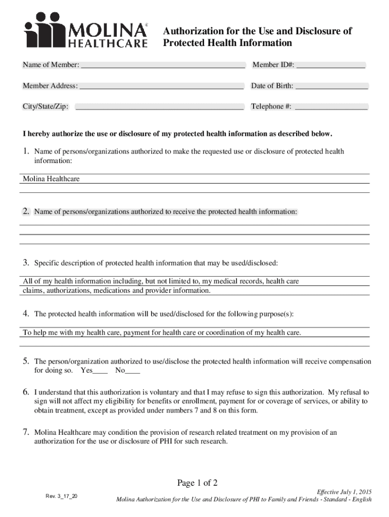 Authorization for the Use and Disclosure of Protected Health Information Name of Member: ___ Member ID#: ___ Member Address: ___ Date of Birth: ___ City/State/Zip:___Telephone #: ___I hereby authorize