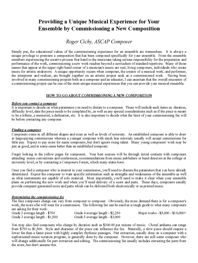 Providing a Unique Musical Experience for Your Ensemble by Commissioning a New Composition Roger Vichy, ASCAP Composer Simply put, the educational values of the commissioning experience for an ensemble