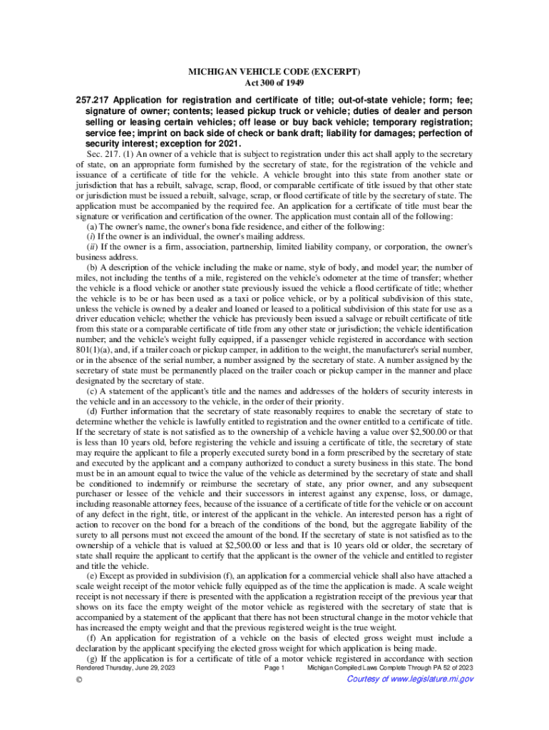 MICHIGAN VEHICLE CODE (EXCERPT) Act 300 of 1949 257.217 Application for registration and certificate of title; outofstate vehicle; form; fee; signature of owner; contents; leased pickup truck or vehicle;