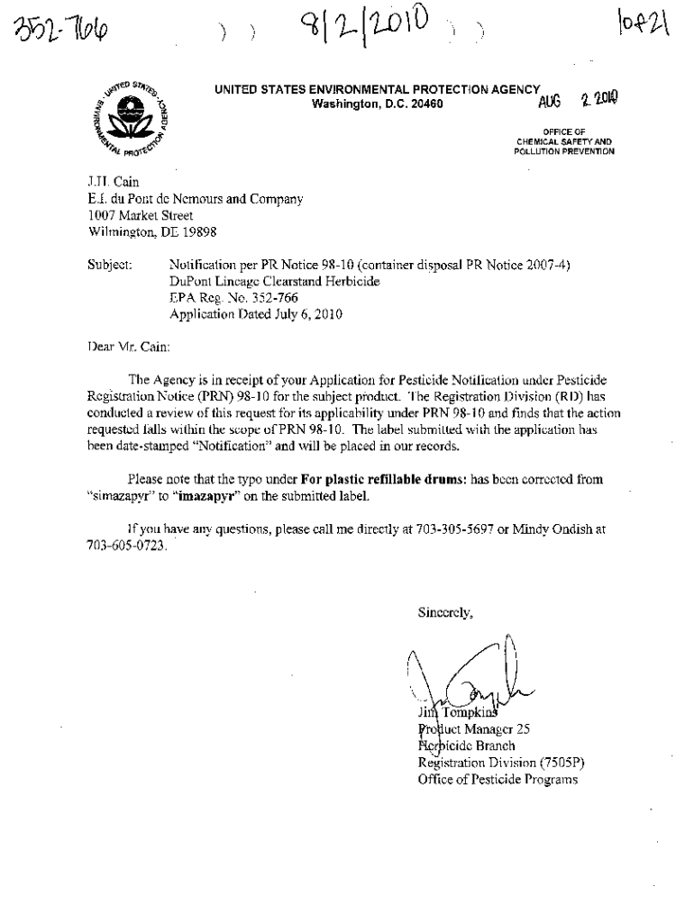 UNITED STATES ENVIRONMENTAL PROTECTION AGENCY Washington, D.C. 20460AUG_IL Lid\'\”\' I. J OFFICE OF CHEMICAL SAFETY AND POLLUTION PREVENTION. B. Cain E.!. Du Pont de Nemours and Company 1007 Market