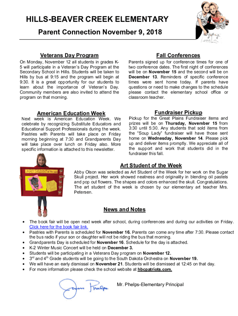 HILLSBEAVER CREEK ELEMENTARYParent Connection November 9, 2018Veterans Day Program Monday, November 12 all students in grades K5 will participate in a Veterans Day Program at they