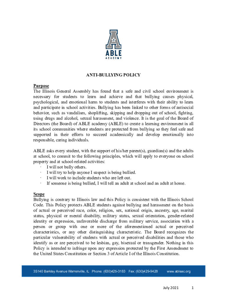 ANTIBULLYING POLICY Purpose The Illinois General Assembly has found that a safe and civil school environment is necessary for students to learn and achieve and that bullying causes physical, psychological,