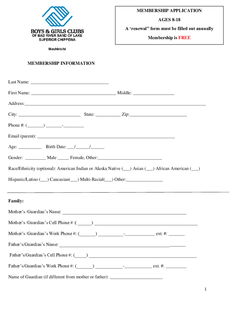 MEMBERSHIP APPLICATION AGES 818 A renewal form must be filled out annually Membership is FREEMEMBERSHIP Informational Name: ___ First Name: ___ Middle: ___ Address:___ City: ___ State: ___ Zip:___