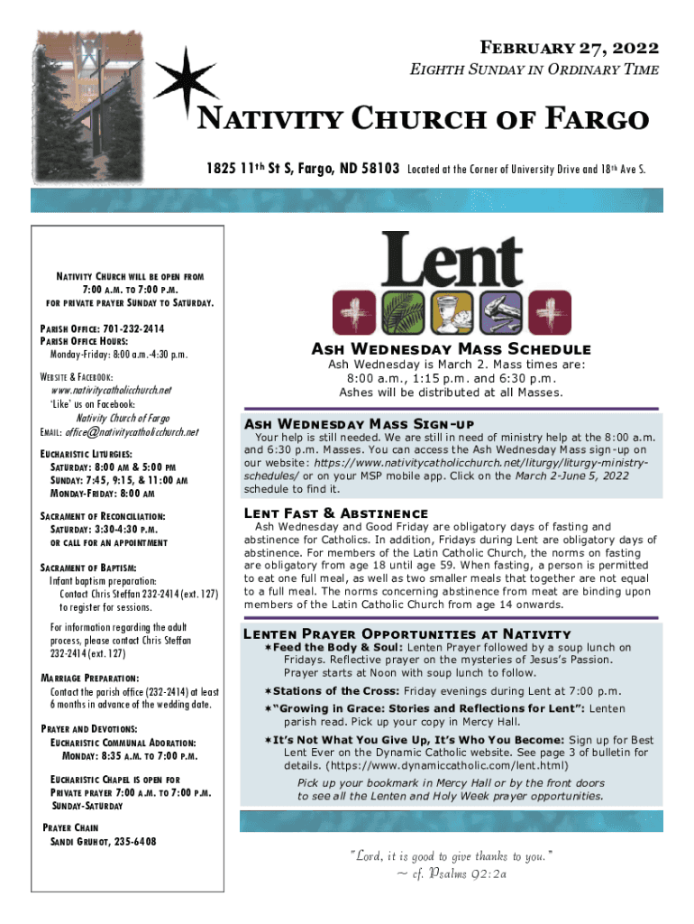 February 27, 2022, Eighth Sunday in Ordinary Time Nativity Church of Fargo 1825 11th St S, Fargo, ND 58103Located at the Corner of University Drive and 18th Ave S.NATIVITY CHURCH WILL BE OPEN FROM