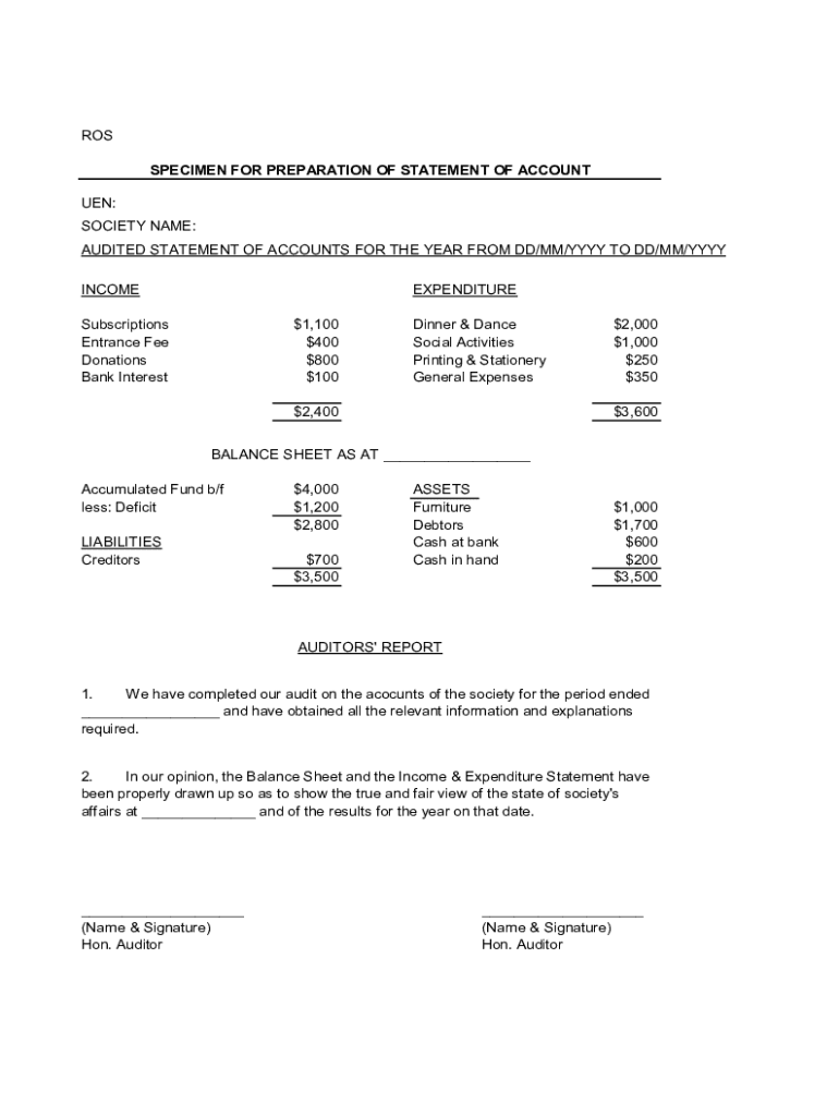 ROS SPECIMEN FOR PREPARATION OF STATEMENT OF ACCOUNT MEN: SOCIETY NAME: AUDITED STATEMENT OF ACCOUNTS FOR THE YEAR FROM DD/MM/YYY TO DD/MM/YYY INCOMEEXPENDITURESubscriptions Entrance Fee Donations