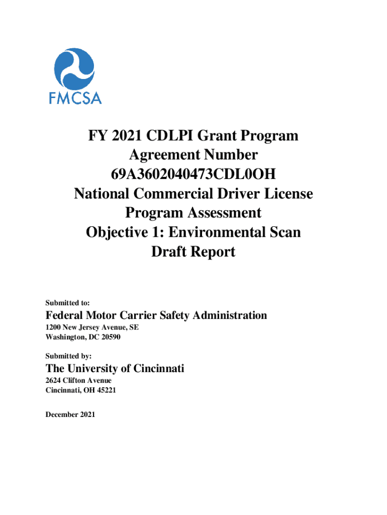FY 2021 CD LPI Grant Program Agreement Number 69A3602040473CDL0OH National Commercial Driver License Program Assessment Objective 1: Environmental Scan Draft ReportSubmitted to:Federal Motor Carrier