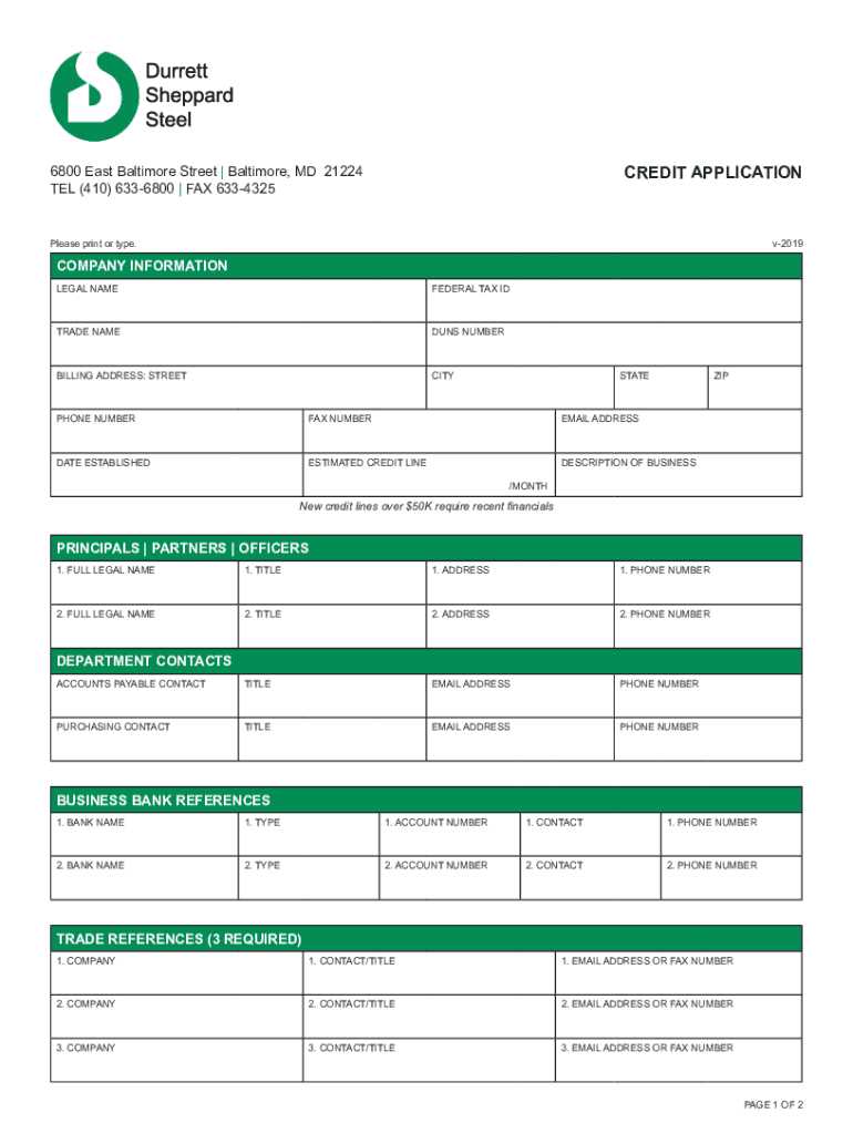 CREDIT APPLICATION6800 East Baltimore Street | Baltimore, MD 21224 TEL (410) 6336800 | FAX 6334325Please print or type.v2019COMPANY INFORMATION LEGAL NAMEFEDERAL TAX TRADE NAMED NUMBERBILLING ADDRESS: