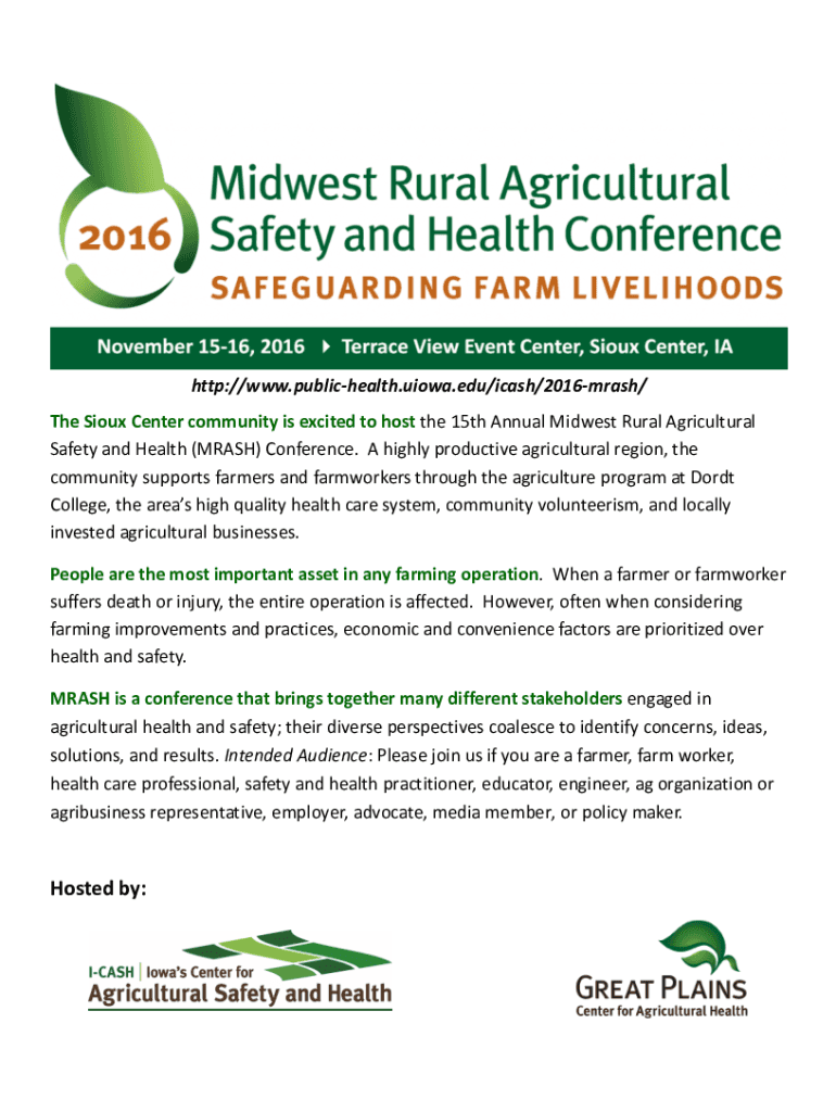HTTP://www.publichealth.uiowa.edu/icash/2016mrash/TheSiouxCentercommunityisexcitedtohostthe15thAnnualMidwestRuralAgricultural SafetyandHealth(CRASH)Conference. Ahighlyproductiveagriculturalregion,