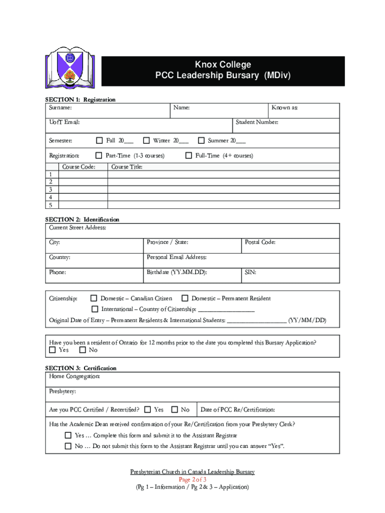 Knox College PCC Leadership Bursary (MDI) Knox College will provide a bursary of 100% of course fees to students who meet the following conditions: Current certification by a presbytery of The Presbyterian