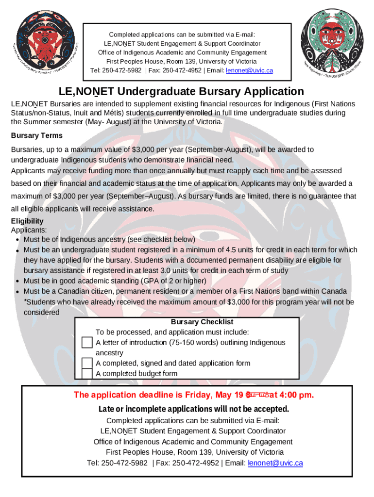 Completed applications can be submitted via Email: LE, NOT Student Engagement & Support Coordinator Office of Indigenous Academic and Community Engagement First Peoples House, Room 139, University