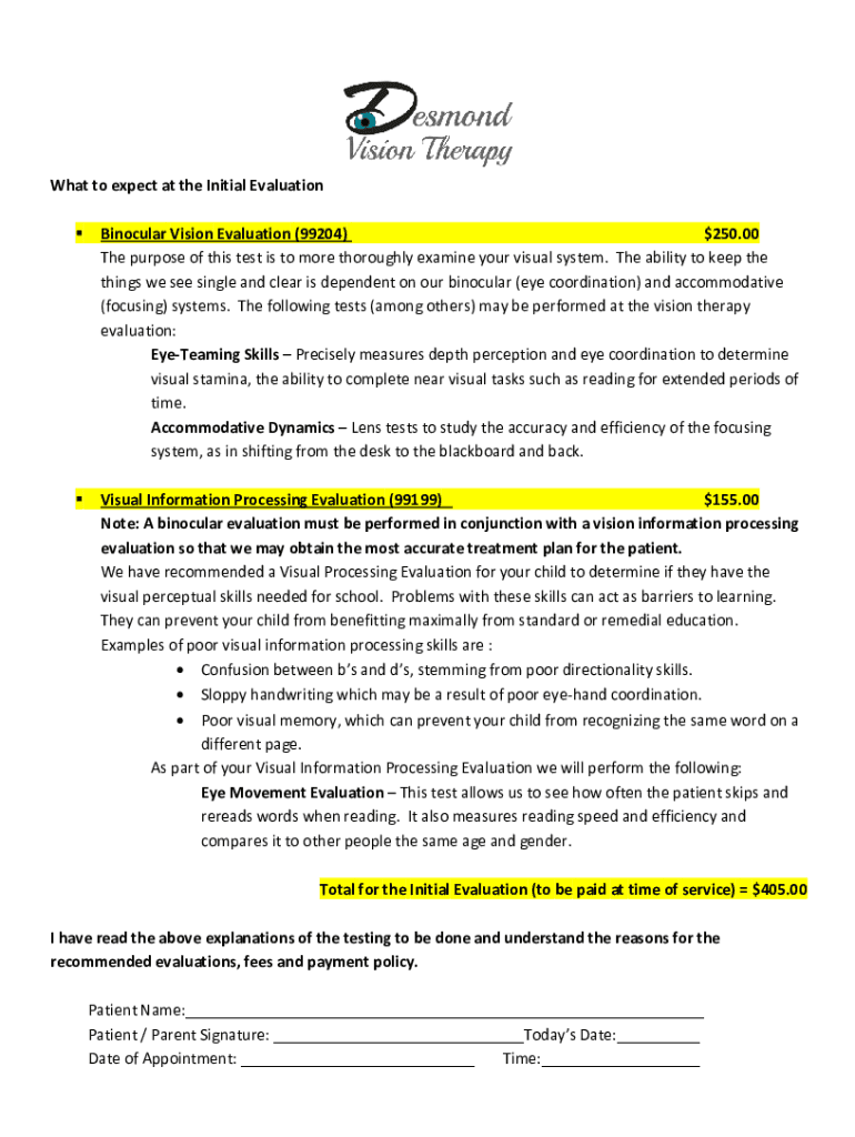 What to expect at the Initial Evaluation Binocular Vision Evaluation (99204) $250.00 The purpose of this test is to more thoroughly examine your visual system. The ability to keep the things we see