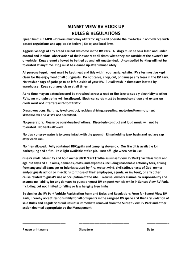 SUNSET VIEW RV Hooks UP RULES & REGULATIONS Speed limit is 5 MPH Drivers must obey all traffic signs and operate their vehicles in accordance with posted regulations and applicable Federal, State,