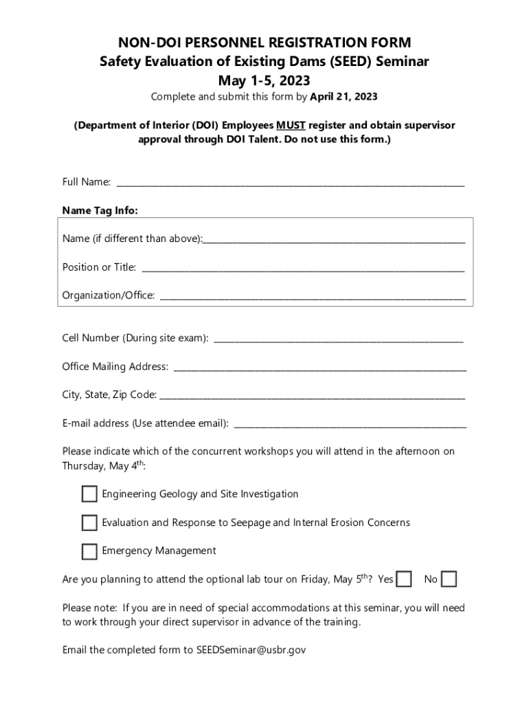 NONDOI PERSONNEL REGISTRATION FORM Safety Evaluation of Existing Dams (SEED) Seminar May 15, 2023, Complete and submit this form by April 21, 2023(Department of Interior (DOI) Employees MUST register