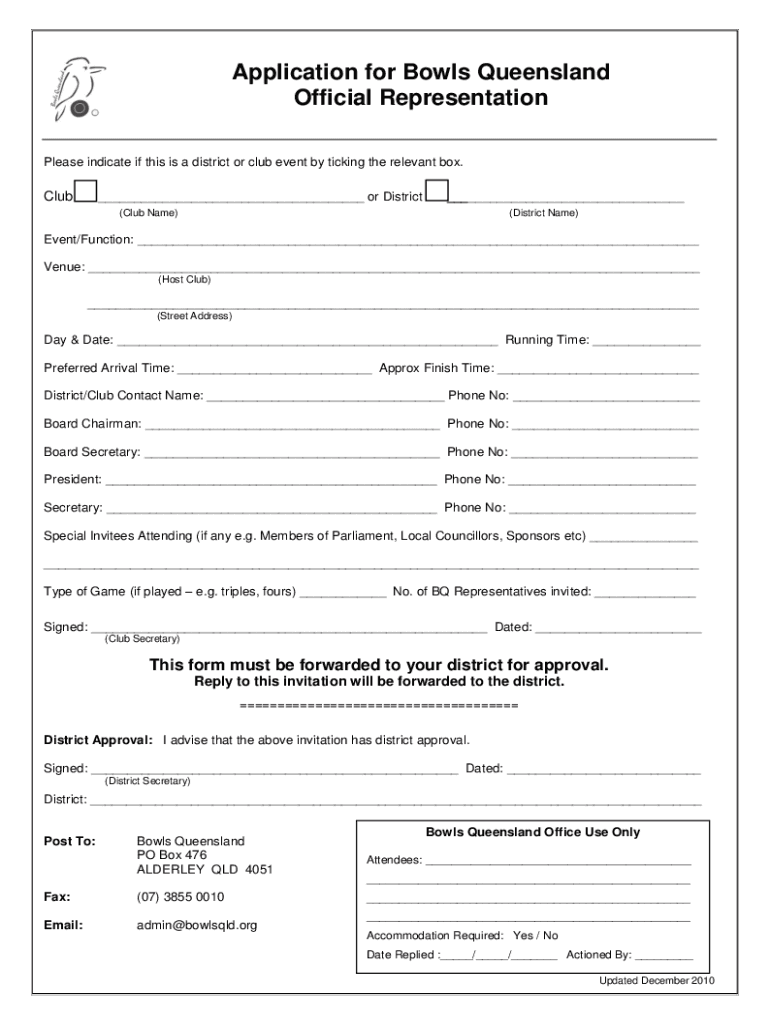 Application for Bowls Queensland Official Representation Please indicate if this is a district or club event by ticking the relevant box. Club ___ or District ___ (Club Name)(District Name)Event/Function: