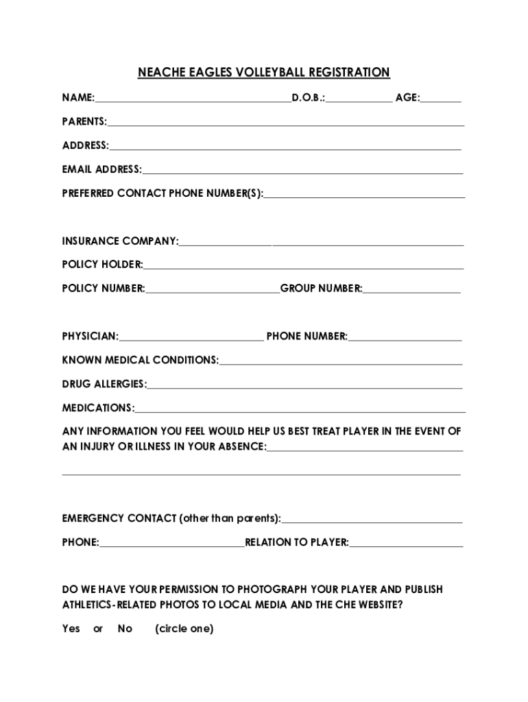 EACH EAGLES VOLLEYBALL REGISTRATION NAME:___D. O.B.:___ AGE:___ PARENTS:___ ADDRESS:___ EMAIL ADDRESS:___ PREFERRED CONTACT PHONE NUMBER(S):___INSURANCE COMPANY:___ policyholder:___ POLICY NUMBER:___GROUP