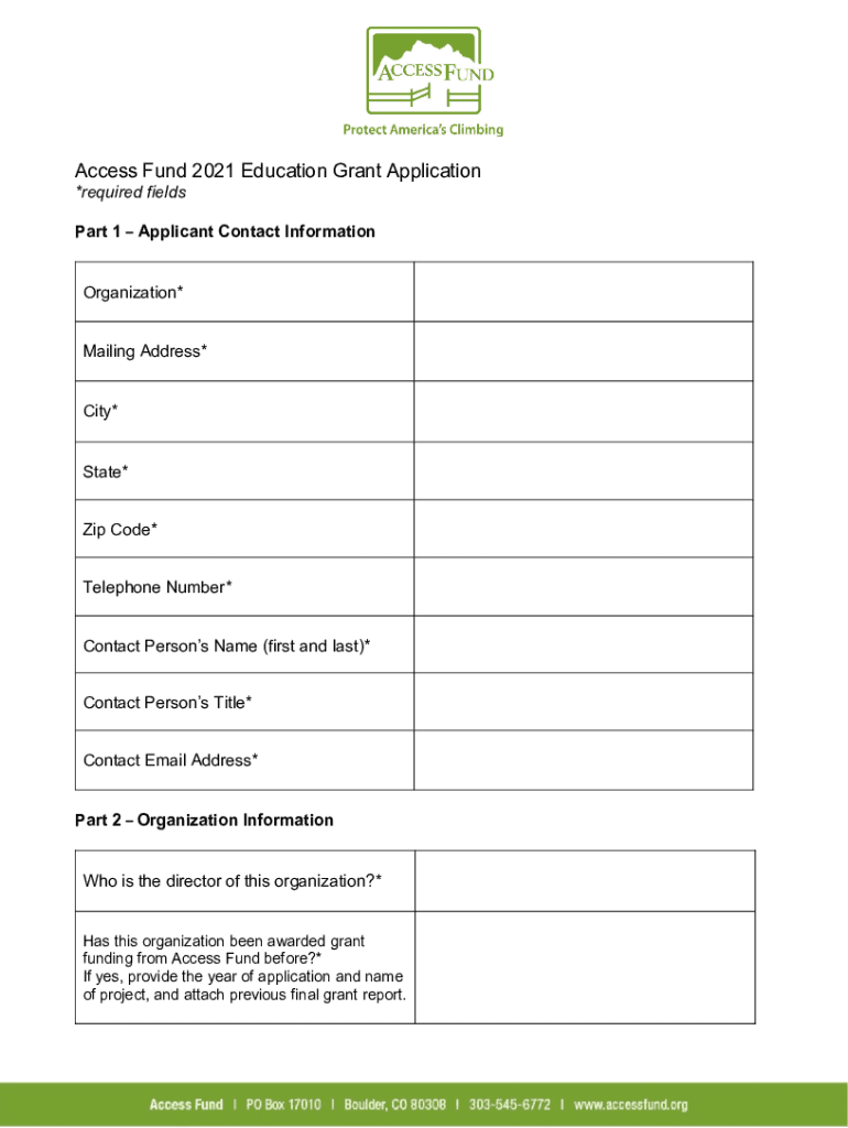 Access Fund 2021 Education Grant Application *required feldspar 1 Applicant Contact Information Organization* Mailing Address* City* State* Zip Code* Telephone Number* Contact Persons Name (first