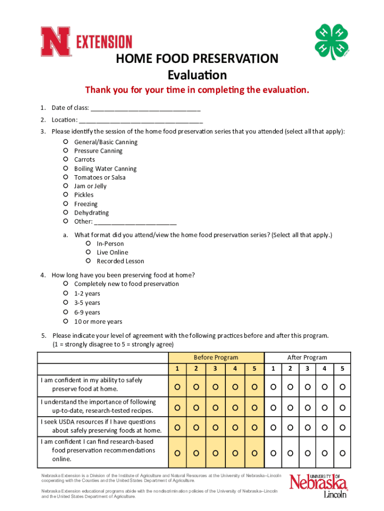HOME FOOD PRESERVATION Evaluation Thank you for your time in completing the evaluation. 1. Date of class: ___ 2. Location: ___ 3. Please identify the session of the home food preservation series that
