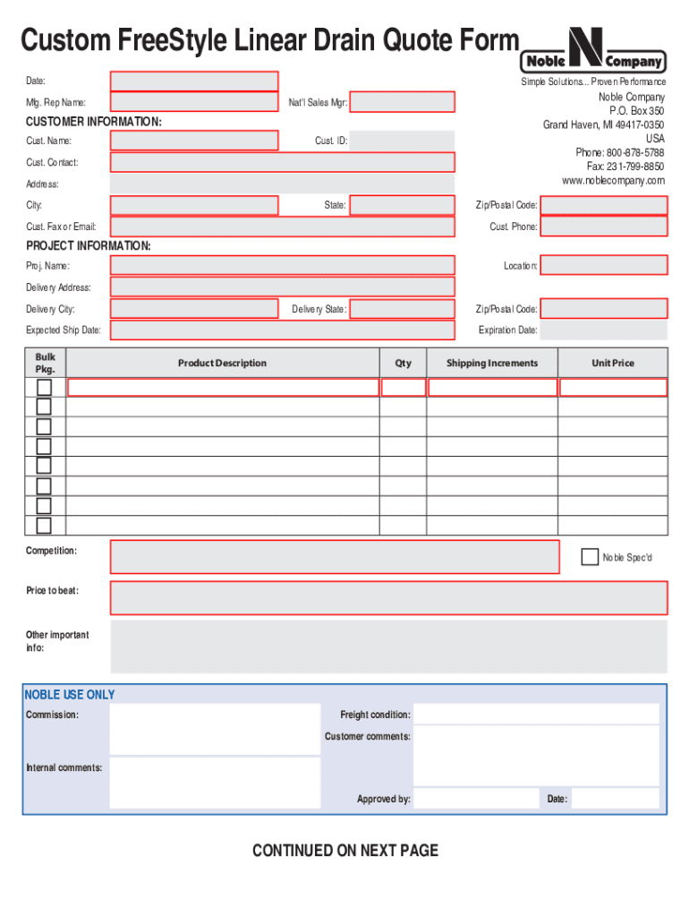 Custom Freestyle Linear Drain Quote Form Date:Simple Solutions... Proven Performance. Rep Name:Noble Company P.O. Box 350 Grand Haven, MI 494170350 USA Phone: 8008785788 Fax: 2317998850 www.noblecompany.comNatl