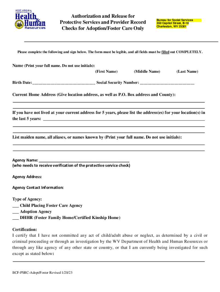 Authorization and Release for Protective Services and Provider Record Checks for Adoption/Foster Care OnlyBureau for Social Services 350 Capitol Street, B18 Charleston, WV 25301Please complete the
