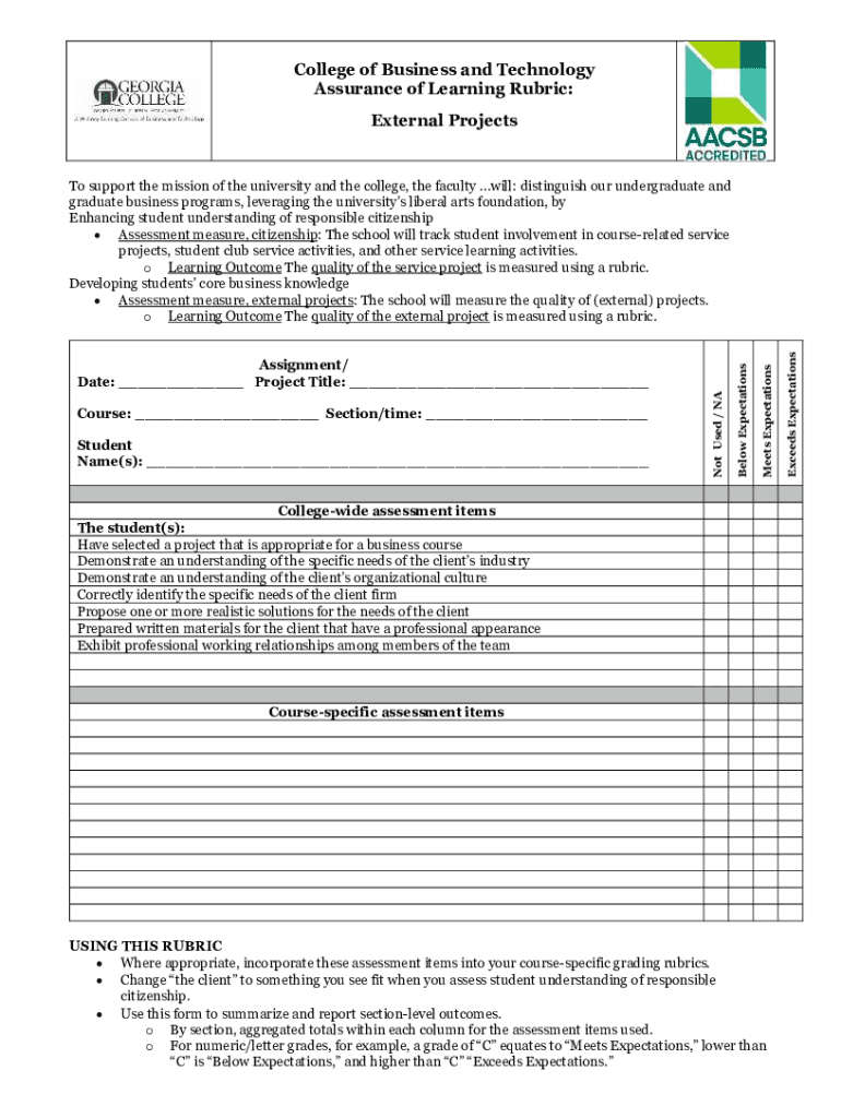 College of Business and Technology Assurance of Learning Rubric: External ProjectsCollegewide assessment items The student(s): Have selected a project that is appropriate for a business course Demonstrate
