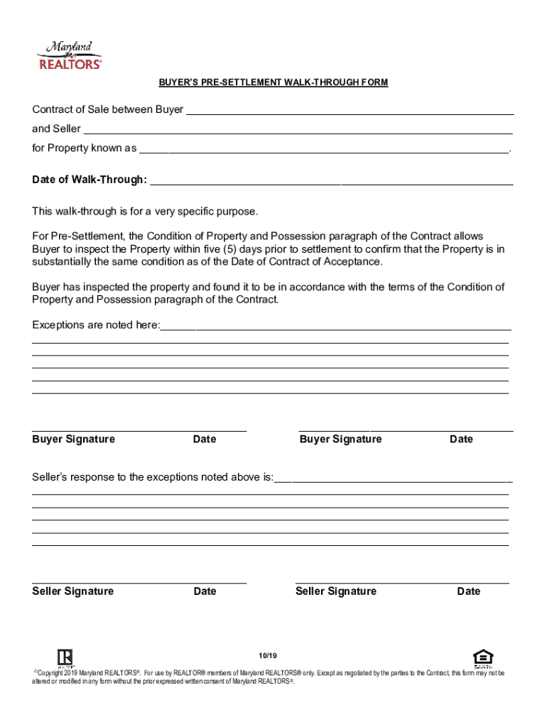 The purpose of the form is to verify that the property is in the agreed-upon condition before the final settlement takes place.