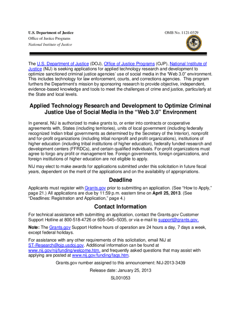 U.S. Department of Justice Office of Justice Programs National Institute of Justice OMB No. 11210329The U.S. Department of Justice (DOJ), Office of Justice Programs (JP), National Institute of Justice