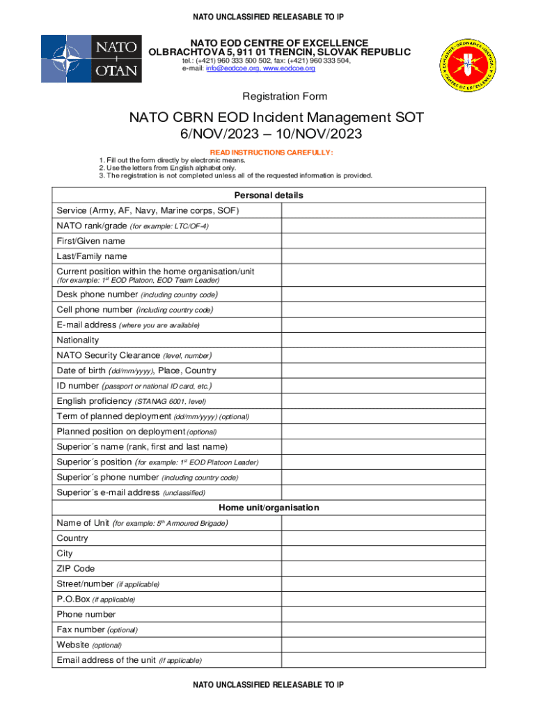 NATO UNCLASSIFIED RELEASABLE TO IP NATO EOD Center OF EXCELLENCE OLBRACHTOVA 5, 911 01 Trenches, SLOVAK REPUBLIC tel.: (+421) 960 333 500 502, fax: (+421) 960 333 504, email: info@eodcoe.org, www.eodcoe.orgRegistration