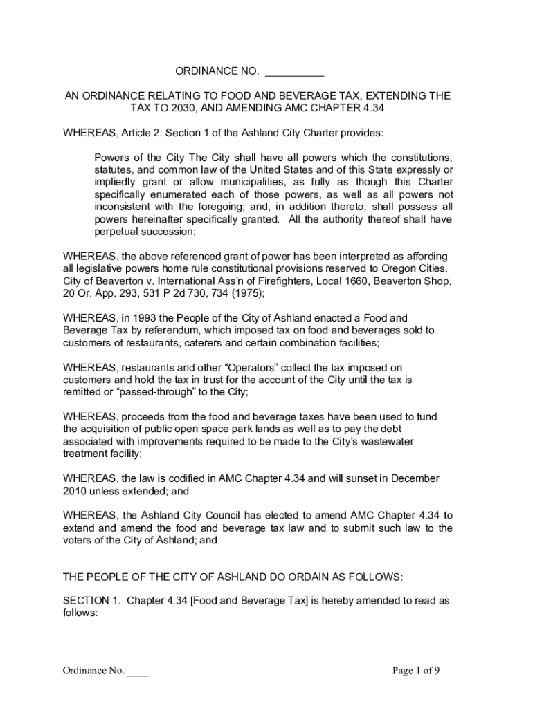 ORDINANCE NO. ___ AN ORDINANCE RELATING TO FOOD AND BEVERAGE TAX, EXTENDING THE TAX TO 2030, AND AMENDING AMC CHAPTER 4.34 WHEREAS, Article 2. Section 1 of the Ashland City Charter provides: Powers