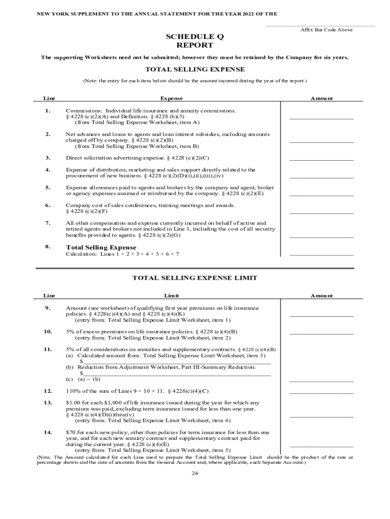 NEW YORK Supplements TO THE ANNUAL STATEMENT FOR THE YEAR 2022 OF RESCHEDULE Q REPORT............................................................................ Affix Bar Code Above supporting Worksheets