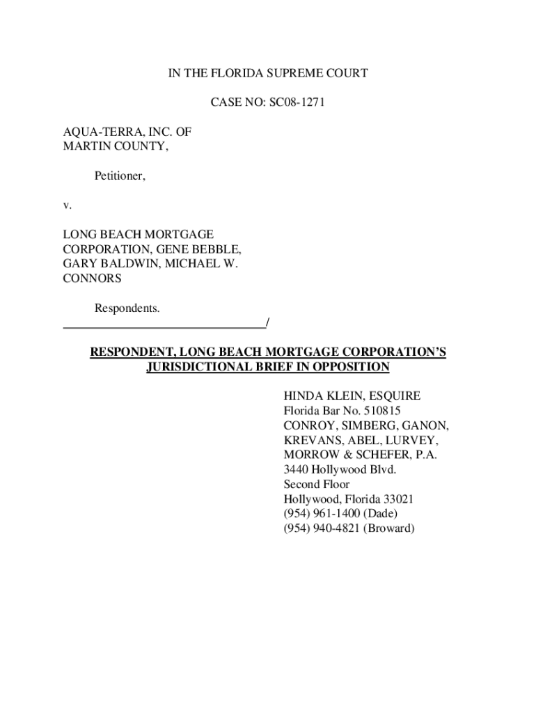 IN THE FLORIDA SUPREME COURT CASE NO: SC081271 AQUATERRA, INC. OF MARTIN COUNTY, Petitioner, v. LONG BEACH MORTGAGE CORPORATION, GENE BUBBLE, GARY BALDWIN, MICHAEL W. CONNORS Respondents. / RESPONDENT,