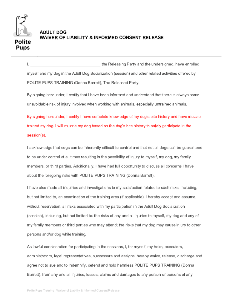 ADULT DOG WAIVER OF LIABILITY & INFORMED CONSENT RELEASED, ___ the Releasing Party and the undersigned, have enrolled myself and my dog in the Adult Dog Socialization (session) and other related activities