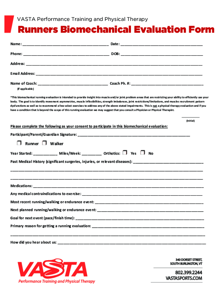 VAST Performance Training and Physical TherapyRunners Biomechanical Evaluation Forename: ___Date: ___Phone: ___DOB: ___Address: ___Email Address: ___Name of Coach: ___Coach pH. #: ___(if applicable)*This